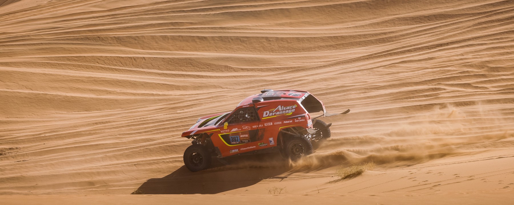 » On a dû se dire 15 fois en pleine course avec Jean-Luc à quel point les paysages que nous avons traversés étaient sublimes. On eu des dunes bien sûr mais aussi des rios, du sinueux à travers la végétation, c’était vraiment varié. D’ailleurs, dans un moment de doute, on s’est engagé dans un canyon et la prochaine note n’était qu’à 5km. On s’est demandé si on s’y risquait ou pas. On a pris le pari de s’engouffrer et c’était le bon choix. Quelque fois, on est resté à fond (130km/h bridé pour les T3 et les T4, contre 180km/h pour les autos) pendant 20km, sur des pistes larges ou dans des rio asséchés, c’est grisant. On a aussi assisté à un abandon en direct en début d’étape: l’alarme de rapprochement retentit dans l’habitacle, signe qu’un concurrent est proche. Je demande à Jean Luc de ralentir, surtout que nous arrivions dans des sommets de dune sans visibilité. Il nous dépasse en ralentissant aussi mais un 4×4 Mini noir qui déboule de nulle part, arrive encore plus fort, s’envole et se plante le nez dans le sable ! On le redépasse et peu de temps après le revoilà ! Il nous refait le même coup, s’envole de nouveau mais cette fois nous ne l’avons plus jamais vu ! »