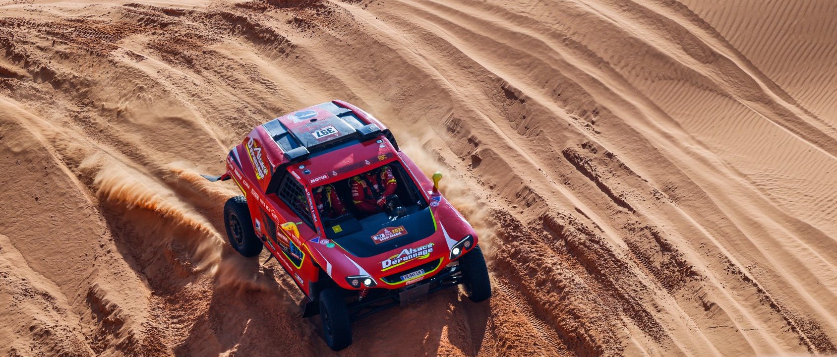 » Dans l’ensemble ce fut une super étape avec un temps très correct à la clé. Plus généralement, nous sommes ravis de notre première semaine. On a réussi à passer à travers les pièges et on a connu qu’une seule crevaison et 3 casses de courroie en 4000km ce qui démontre aussi notre approche raisonnée et la fiabilité de notre dromadaire mécanique. Sur la longue liaison qui nous menait au départ, on rattrape Lionel Baud, notre coéquipier lui aussi sur Zephyr, qui a un soucis de bobines et de bougies. On le suit jusqu’à retrouver notre assistance qui nous attendait pour retirer les pare-brise. Lionel qui pointe 15min avant nous, part mais les mécaniciens se rendent compte que si son problème réapparait, il va lui manquer des outils spécifiques. On décide de les embarquer avec nous, juste au cas où. Et on a bien fait. On retrouve Lionel et Loic au milieu des dunes, arrêtés, en train de mécaniquer. On leur jette la boite de clé et on repart aussitôt. Jusqu’au refuel au km125, tout s’est trés bien passé, avec un Jean Luc très à l’aise dans les dunes, ça roulait sur un très bon rythme. Bien aidé il faut le dire, par un autre coéquipier toujours sur Zephyr, Mansour Al Helei. Il nous a ouvert la route et ça se voyait qu’il avait l’habitude de ce terrain, ça roulait très trés vite, on s’est même permis de doubler une Mini ! Quel panard ! On a aussi croisé Loeb arrêté et surtout mon ancien coéquipier Mika Pisano en train de changer un cardan. »