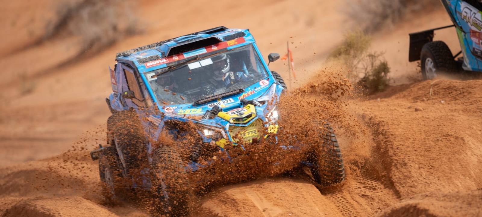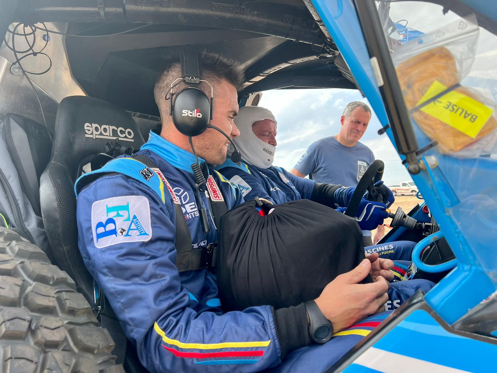 » On espérait que la spéciale galère arriverait un peu plus tard dans notre course. Loupé. Ce fut une journée chaotique mais nous sommes là et il en faudra plus pour nous décourager. J’ai un peu perdu la notion des distances mais tout allait très bien jusqu’à la première grande dune. A cause des fortes pluies que nous subissons depuis Samedi, rare dans cette région du globe, le sable devient lourd et très mou. Après plusieurs tentatives mais en évitant l’ensablement, nous parvenons à franchir ce premier obstacle, plutôt satisfait. La surchauffe du moteur nous poursuit depuis le Prologue sans que parvenions à comprendre la cause et nous oblige à rouler moins vite que la majorité des concurrents, environ 80km/h. Mais c’est la casse de la courroie qui marque un vrai tournant dans la physionomie de notre course. L’opération nous aura pris 20 minutes au lieu de 10 en temps normal car celle-ci c’était disloquée et enroulée un peu partout. A peine 5km après, nous crevons à l’arrière gauche et nous manquons de partir en tonneau. Nos coéquipiers Benoit et Cédric qui passent peu de temps ensuite, nous proposent leur aide mais nous leur disons de continuer car ce n’est qu’une simple crevaison.La zone de refuel au CP km207 marque une pause bienvenue mais pas la fin de nos galères. »