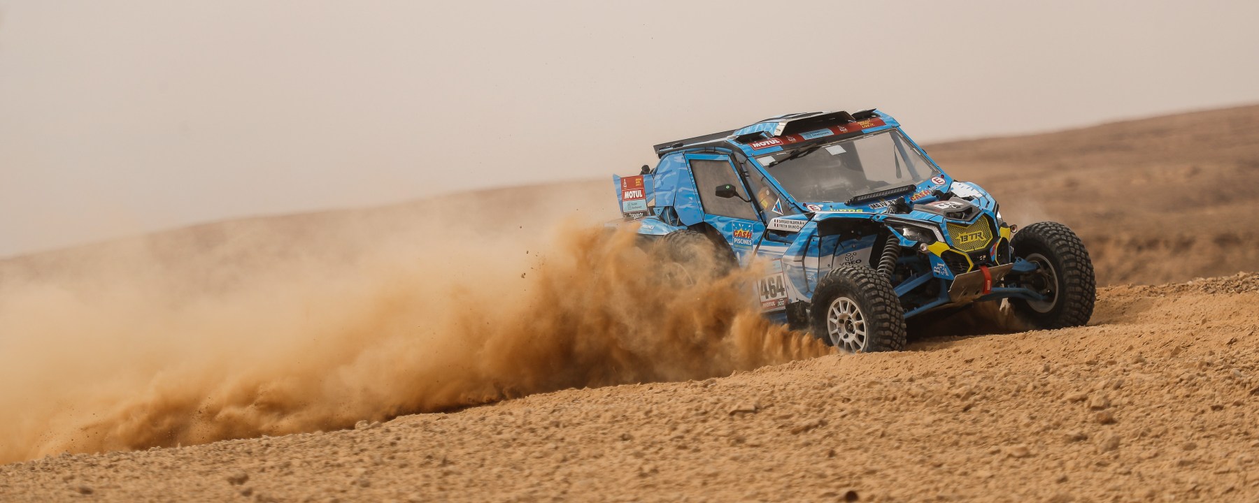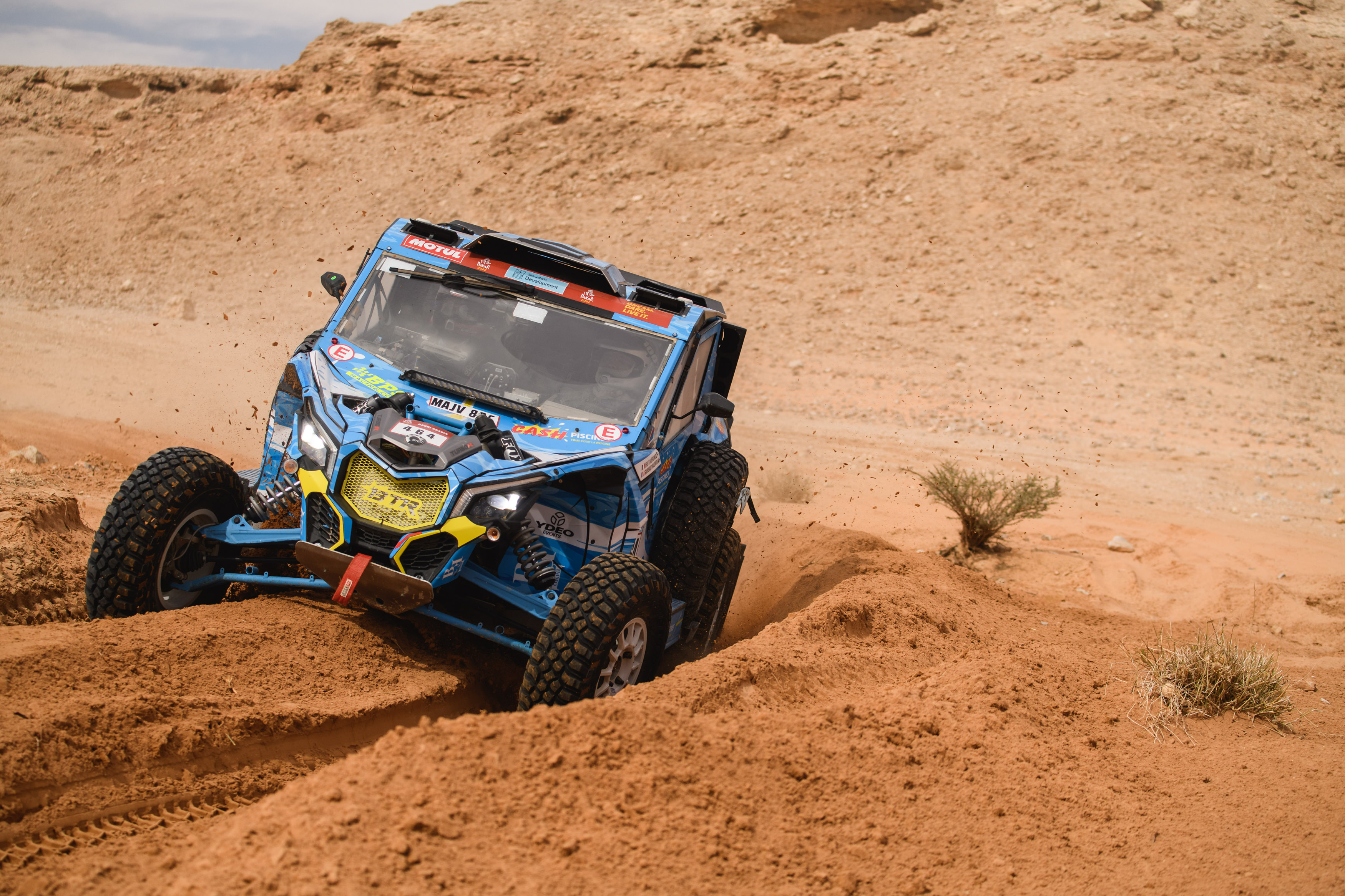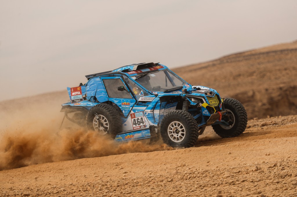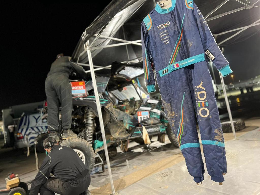 » Benoit et Cédric qui avaient repris de l’avance, ont rameuté tous les camions et les SSV pour trouver une pièce de secours, et ils ont réussi ! Sacrée assistance rapide ! Après le refueling et la neutralisation de 20min, on sort de la zone et on attaque le changement de tirant, qui nous aura pris une dizaine de minutes. Un immense merci pour l’état d’esprit et la solidarité de nos coéquipiers du Can-Am #463 Benoit Fretin et Cédric Duple mais aussi à Eric Croquelois et Hugues Lapouille du #341 pour le prêt de leur tirant de secours. Nous avons pu finir la spéciale et nous avons d’ailleurs recroisé le #341 posé dans les dunes. Nous nous sommes arrêtés pour les aider mais il s’agissait d’un problème électrique donc nous sommes repartis. Très heureux de l’étape du jour d’un point de vue navigation, j’ai pris beaucoup de plaisir, on était à l’aise, bien calé, pas d’erreur mais c’est bien sûr dommage pour la mécanique. Nous perdons finalement peu de temps grâces à nos coéquipiers et au concurrent 341. Nous ne sommes pas mécontent d’être à la journée de repos, grosse révision en vue pour les autos mais aussi les hommes et femmes de tout le bivouac. »