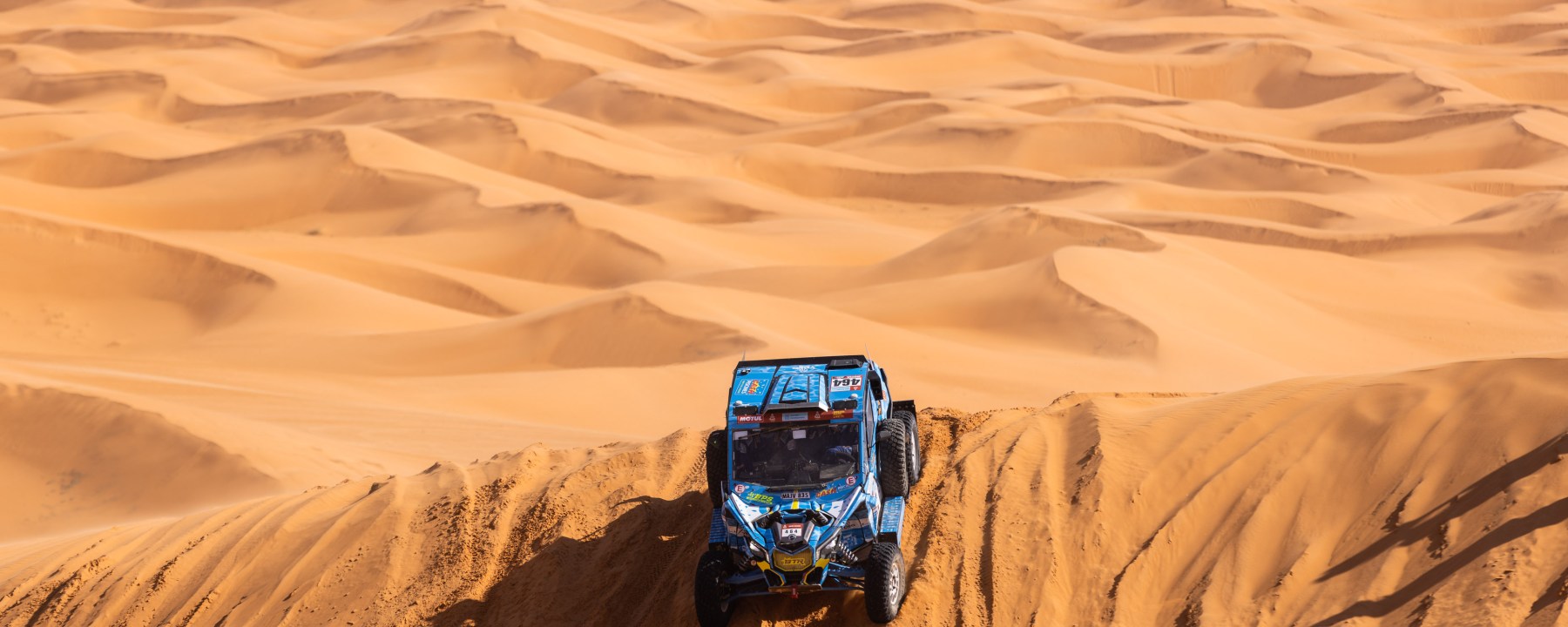 » En fin de journée, nous avons eu quelques hésitations pour « claquer » des waypoints mais nous n’avons jamais perdu trop de temps. On a surtout pris quelques risques pour doubler sur les grands plateaux et se retrouver devant les autres afin d’y voir plus clair. En toute fin d’étape, on se pose malheureusement sur la crête d’une dune par manque de vitesse et nous perdons 15min, le temps de repartir en utilisant seulement le rateau. Patrice et Jérôme ont eu plus de problèmes avec des coupures moteur et une coupure brutale à 30km de l’arrivée. Ils arrivent juste au bivouac et perdent gros au classement. Il nous restait encore 1h de nuit pour venir à bout de ce 7ème chrono et toujours autant compliqué. J’ai pris plus d’avance dans mon annonce pour permettre à Bruno d’anticiper lui aussi et il s’en est super bien tiré. Avec ce 19ème temps scratch, nous aurons une super position de départ demain et nous serons dans le bon wagon. Nous soummes vraiment vidés et épuisés ce soir ! »