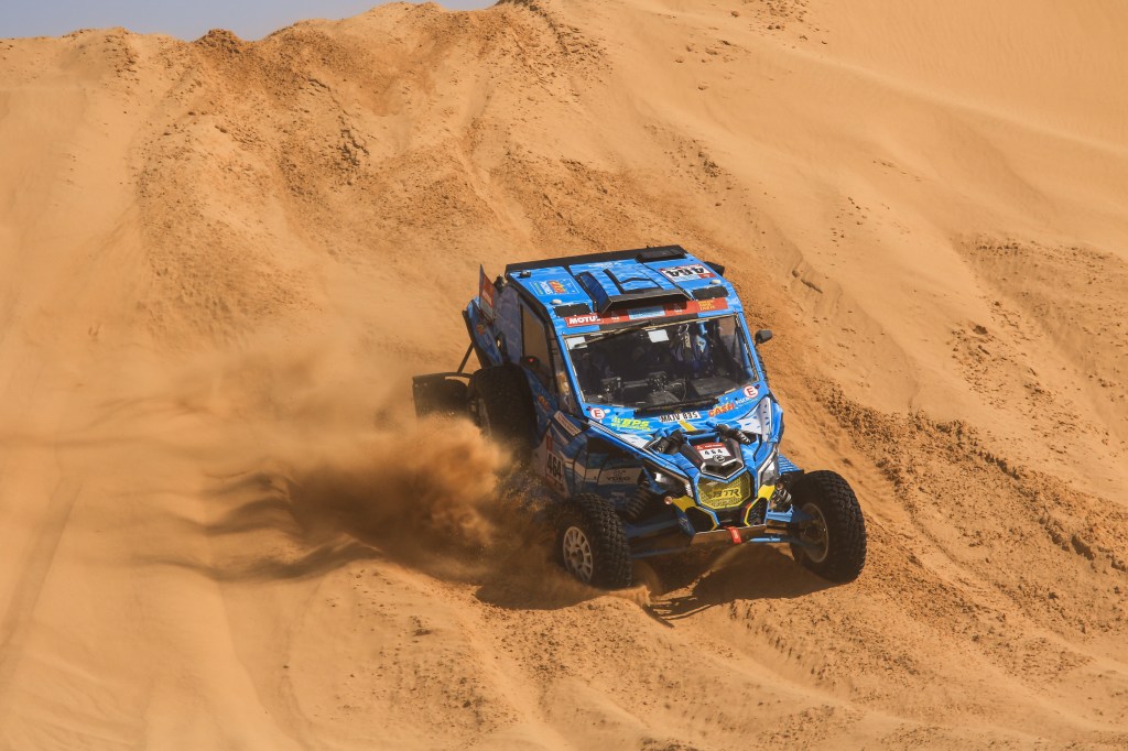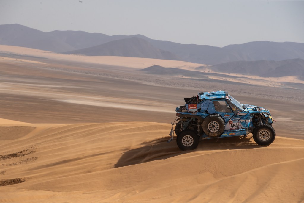 » Même si nous avions nos 4 roues, le train arrière était bien tordu, sans parler de la perte de la direction assistée et d’un soucis électrique. Mais nous finissons par repartir en ayant perdu moins de 10min, un petit miracle. Le véritable exploit est celui de Bruno qui aura réussi à rallier l’arrivée et les 310km restants au milieu des dunes et finir de nuit sans direction assistée et avec un pouce tordu. Chapeau. Nous n’avons pas fait d’erreur de navigation et je me suis une nouvelle fois régalé quand ça se passe comme ça. On a mangé beaucoup de poussière pour ne rien arranger mais ce n’est rien comparé au calvaire qu’on vécu nos coéquipiers Patrice et Jérôme qui sont actuellement remorqué pour rentrer au bivouac. Encore 5h de route et une nuit très courte pour tenter de réparer et repartir hors classement. Pour soulager Bruno, c’est moi qui est effectué les 260km de liaison dont 70km de piste de nuit. On partage tout dans un équipage du Dakar ! On s’excuse d’avance pour le boulot que vont désormais avoir les mécanos mais on leur fait confiance. »