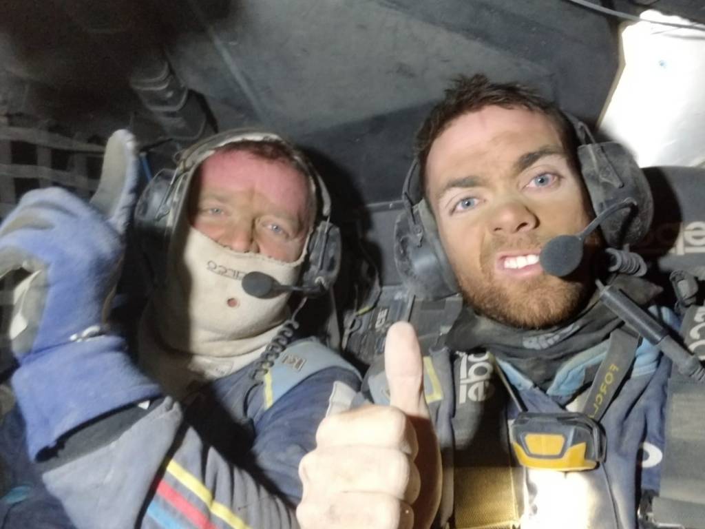 » Là bas, on y retrouve notre camion qui a contourné les dunes par la route. Nous avons 2 options: terminer les 100km de chrono en moins de 4h pour ne pas être hors course ou effectuer 150km par la route et remonter à l’arrivée pour la franchir en course et rester finisher. On ne réfléchi ps longtemps et on opte pour la sagesse surtout après les commentaires sur ce qui nous attend, surtout que le camion ne fera pas la dernière partie à cause des grandes dunes. Nous serions livrés à nous même cette fois. Nous voulons mettre un point d’honneur à terminer en course alors la question ne se pose pas. Nous sommes rentrés très tard ce soir mais nous l’avons fait. Merci à tous ces mécanos, nos coéquipiers, ces machines de la mécanique qui une fois encore, nous permette d’espérer atteindre le podium final. Plus qu’un dodo-sable mes amours, on l’aura cette médaille. »