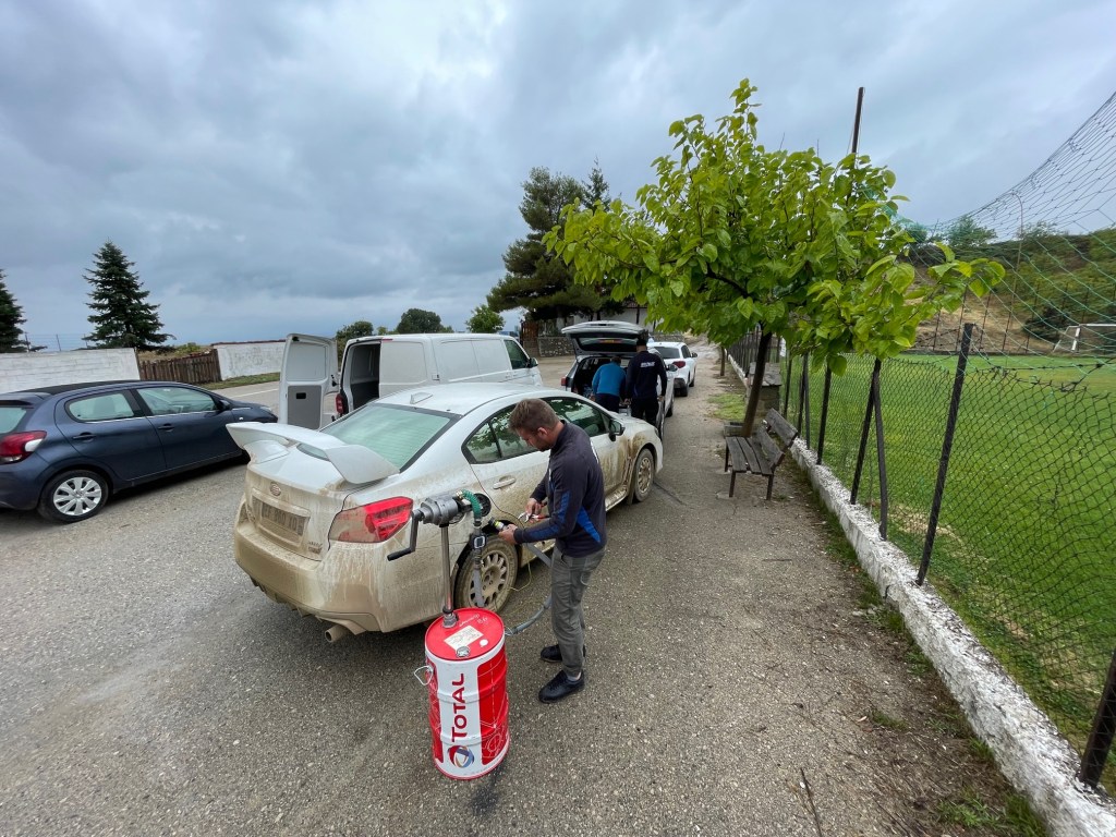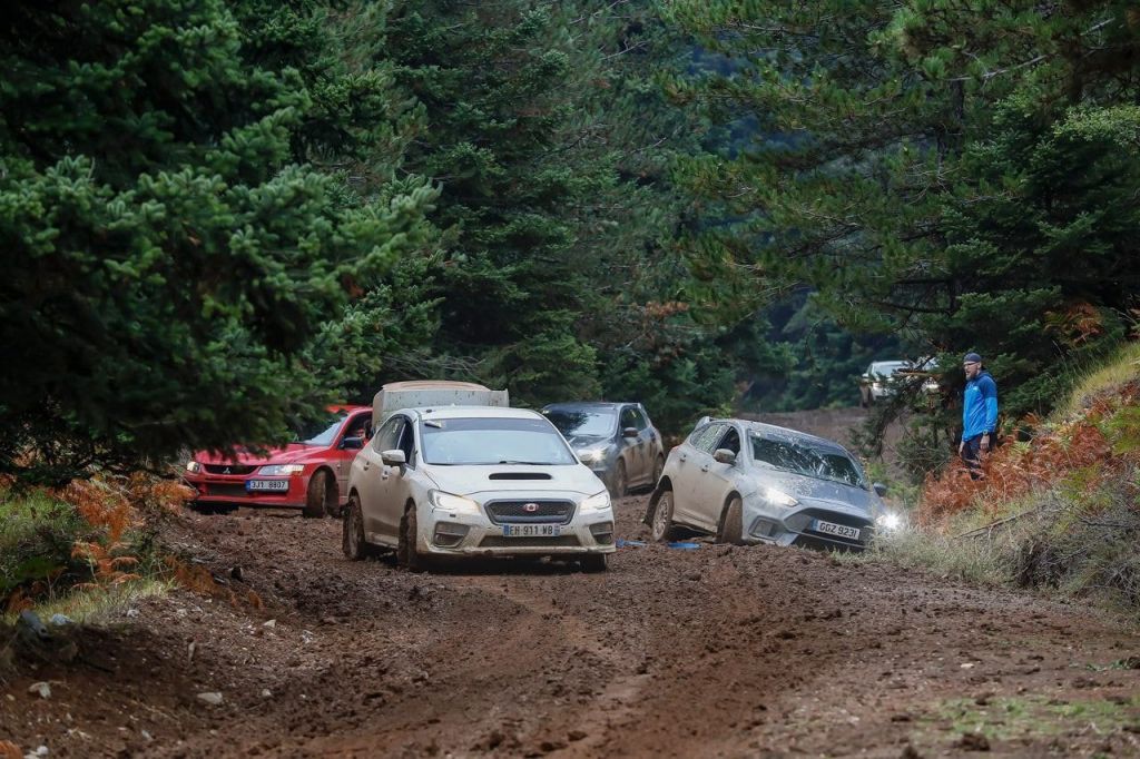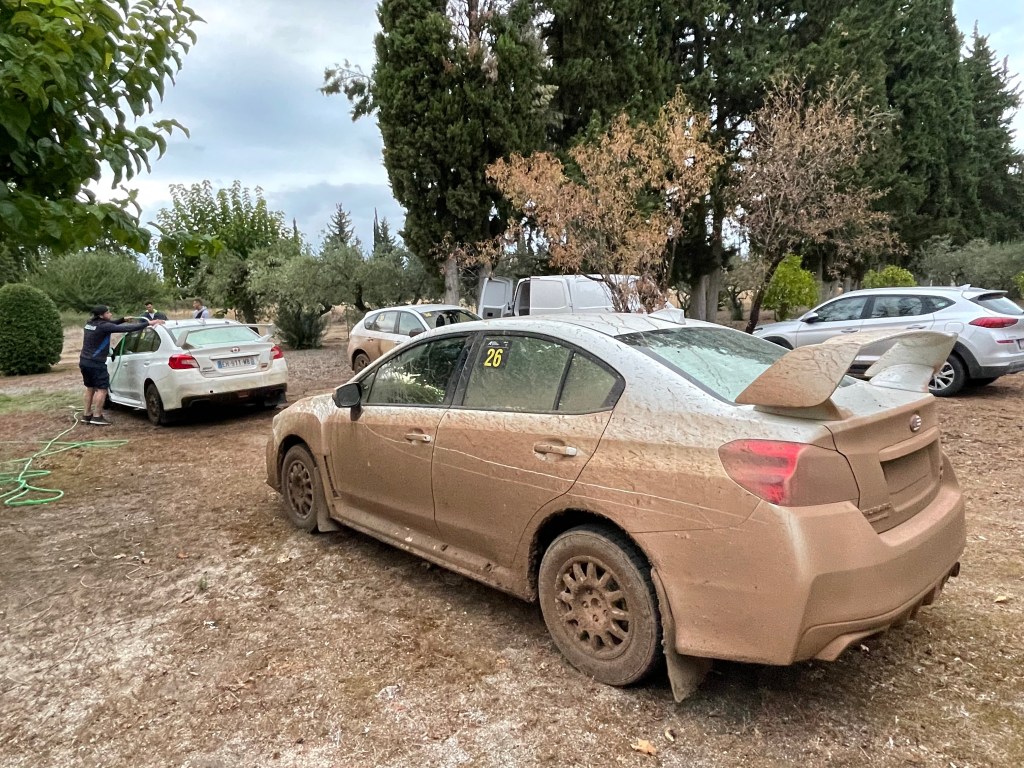 Le dernier jour, à l’arrivée de Pyrgos sous une pluie continue, le propriétaire d’un café perdu en forêt, et ancien cascadeur, nous a gentiment proposé une boisson chaude et son numéro de téléphone pour faire homme météo local. L’hospitalité grecque n’est pas usurpée. Je n’oublie pas les soins prodigués par Clément aux anciennes Subaru de recos utilisées par Citroën en 2019 (ex-Ogier pour Sean). Tous ces détails rassurent les pilotes et copilotes et leur font gagner un temps précieux. Le mardi soir par exemple, nous avons passé une partie de la soirée, derrière l’hôtel des équipages avec un tuyau de jardinage, à nettoyer la boue des 3 voitures et faire les pleins pour qu’ils puissent attaquer la dernière journée sereins. Mercredi soir, nous étions fatigués mais heureux d’avoir pu vivre cette préparation de course au plus près (et d’avoir pu conduire les fameuses Subaru).