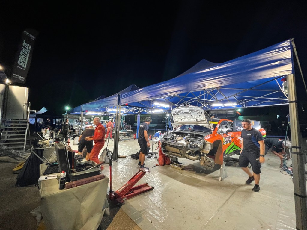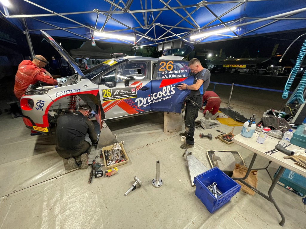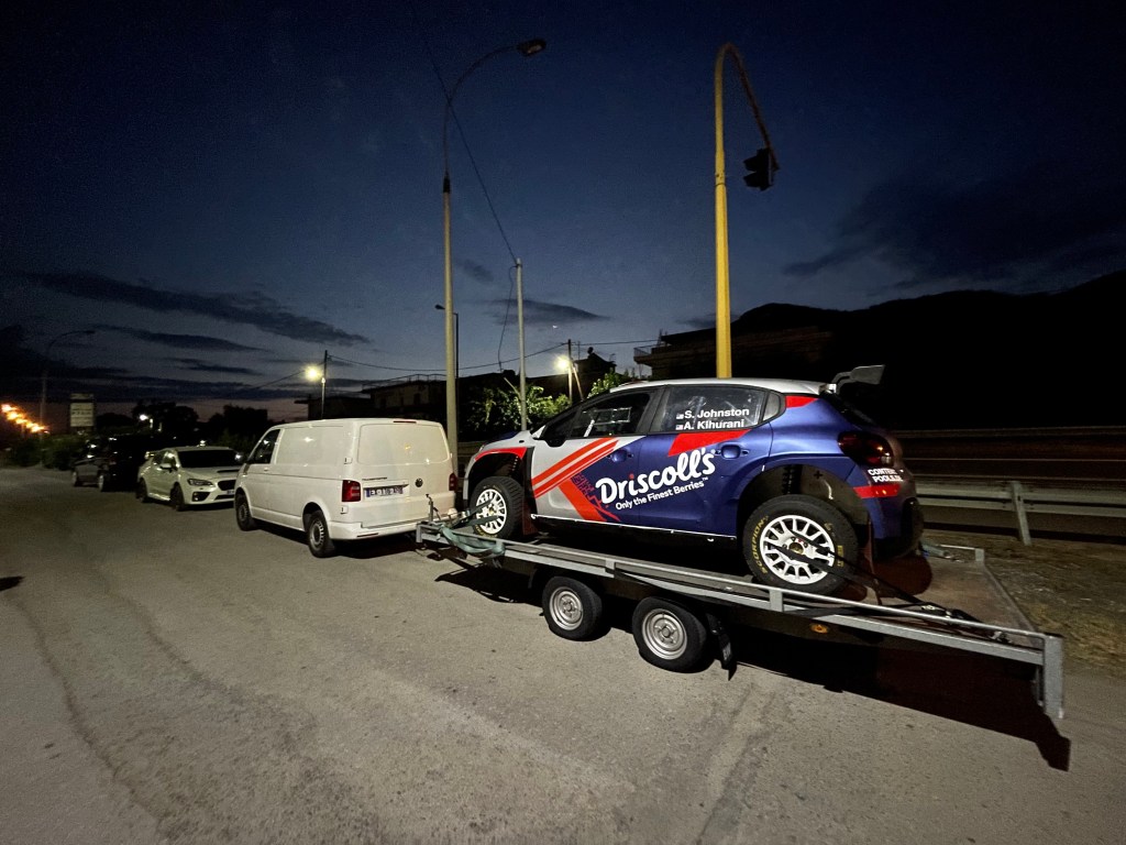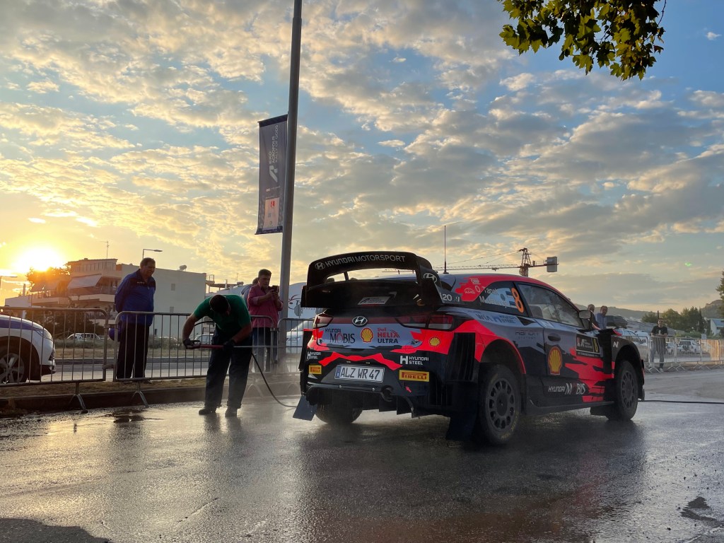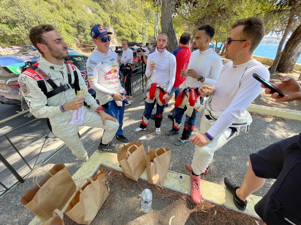 Au petit matin, nous quittons la capitale et ses bouchons pour éviter à nos équipages la mauvaise surprise de devoir gérer seuls leurs pneus à Loutraki. Le soleil est cette fois bien revenu et la course enfin lancée. Grâce à WRC+, les splits SAS et les différents groupes Whatsapp, il est très simple de communiquer et suivre la course. Vincent est aussi rapide que la FIA pour transmettre tous les additifs et COC de l’organisation. Sur place, il faut donner l’emplacement attribué à notre voiture et s’assurer qu’il n’y a pas plus d’une personne pour aider et pas d’autres outils que le cric. Les chefs de voiture récupèrent leurs pneus au camion Pirelli et les ingénieurs, Thomas Breton et Steffan, établissent les stratégies pour les spéciales suivantes. De mon côté, j’amène les paniers repas et surtout l’eau à leur arrivée au regroupement puisqu’après c’est interdit. Les voitures souffrent déjà mais les réparations possibles sont très limitées, uniquement avec ce qui se trouvent déjà dans l‘auto. Ostberg qui a cassé une transmission, devra retirer la seconde et pointera en retard. A peine « Crazy Leo » repartit, qu’il nous faut tout charger et rentrer à l’assistance pour préparer la Flexi-Service du soir.