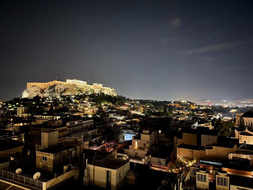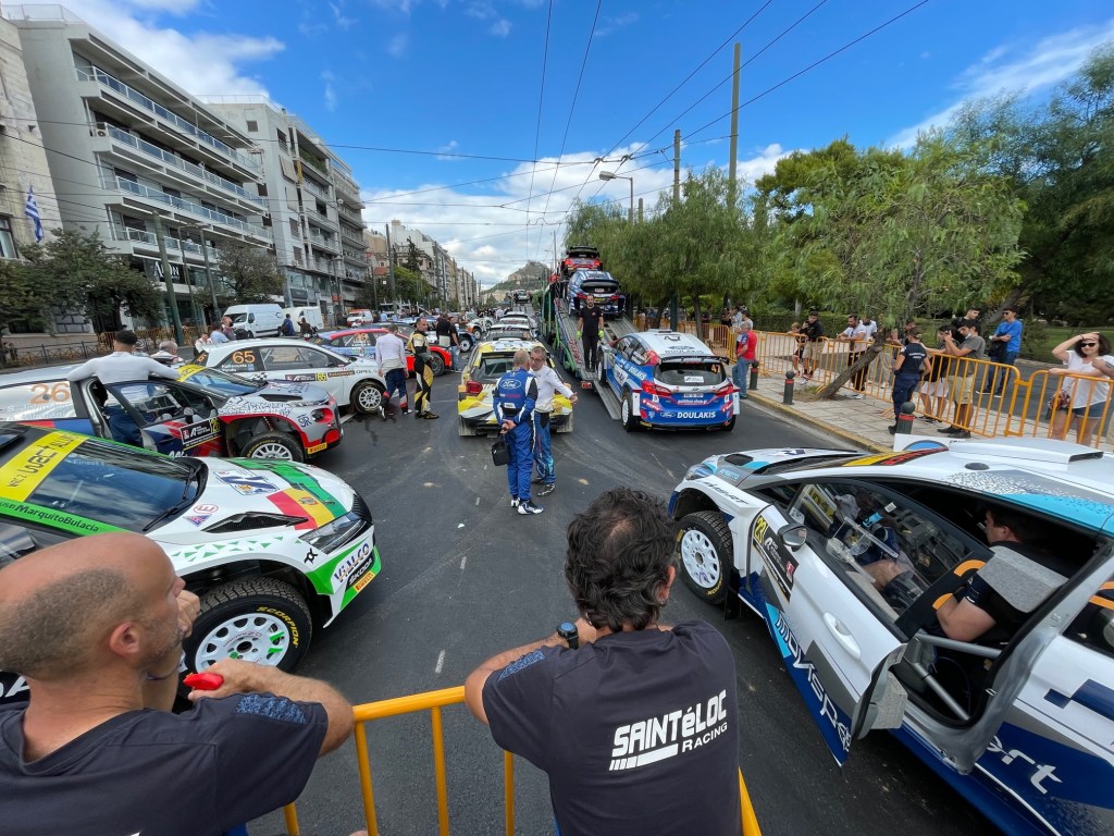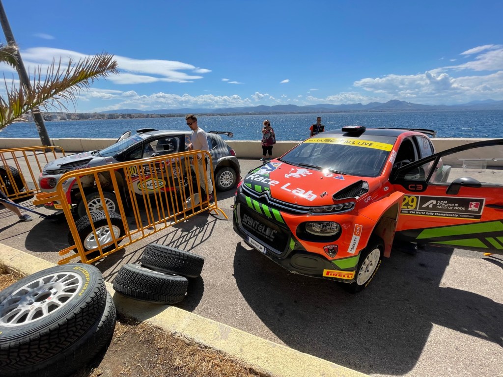 Les choses sérieuses débutent ce jeudi. Après un team briefing la veille, nous voici en place à 7h pour débuter le shakedown. Le timing sera serré puisqu’il faut nettoyer, réviser et charger les autos avant 10h30 pour partir sur Athènes. Étant donné les conditions encore très galloises, nos équipages ne s’attardent pas et nous font gagner un temps précieux. Pour ce déplacement et le reste de la course, nous formons une équipe « volante » composée des 3 chefs de voitures, des 2 ingénieurs, de Clément et moi-même. Après Athènes, nous nous déplacerons sur chaque TFZ (une par jour), soit quelques heures de route en perspective. Le reste de l’équipe devra patienter jusqu’à l’assistance de vendredi soir pour retrouver les C3 Rally2. Comme prévu, les derniers mètres dans Athènes sont un calvaire car il nous est impossible d’approcher la zone de déchargement. Finalement en négociant avec la police, nous finissons par trouver une porte d’entrée sur le grand boulevard vide pour l’occasion, réservé aux camions qui transportent les autos. Nous y réalisons notre premier scratch : les 3 C3 Rally2 restent seules dans la Holding Area pendant presque deux heures. A se demander si nous nous étions trompé d’endroit ! Mais bien nous en a pris puisqu’au moment où nos équipages débutent les recos de la super spéciales en voiture de course et en combinaison, toutes les autres équipes débarquent en même temps dans un capharnaüm sans nom. Après avoir sué pour parquer notre remorque dans un parking souterrain, nous pouvons rentrer à l’hôtel réservé par l’organisateur et profiter d’une vue incroyable sur l’Acropole au dixième étage.