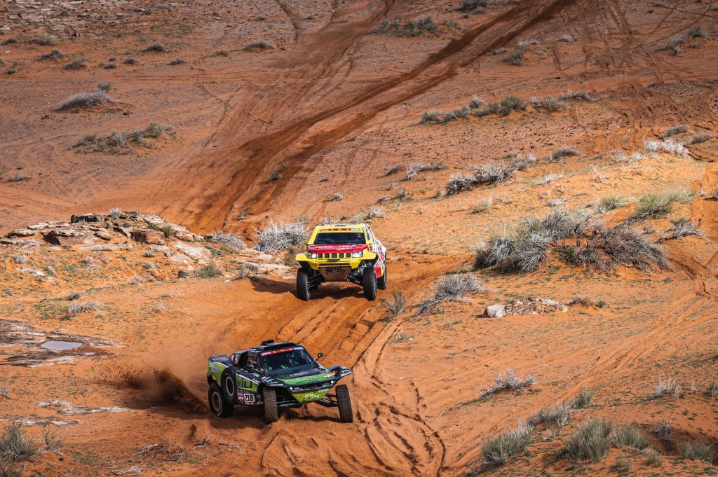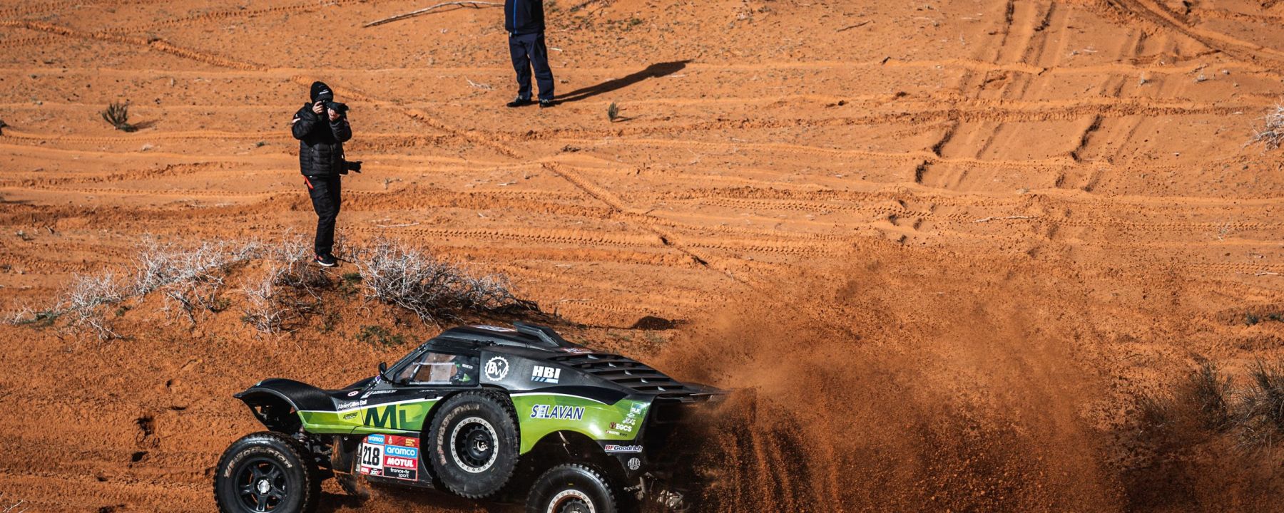 Le vent a balayé la tempête qui s’est abattue sur la région de Ha’il hier. C’est donc dans la fraicheur et sur un terrain redessiné par les orages que les concurrents se sont élancés ce matin. Tracé dans des canyons et sur des hauts plateaux jonchés d’herbe à chameau et de dunes immenses, le profil ne descend jamais sous les 800 mètres et culmine même à près de 1300 mètres d’altitude.
