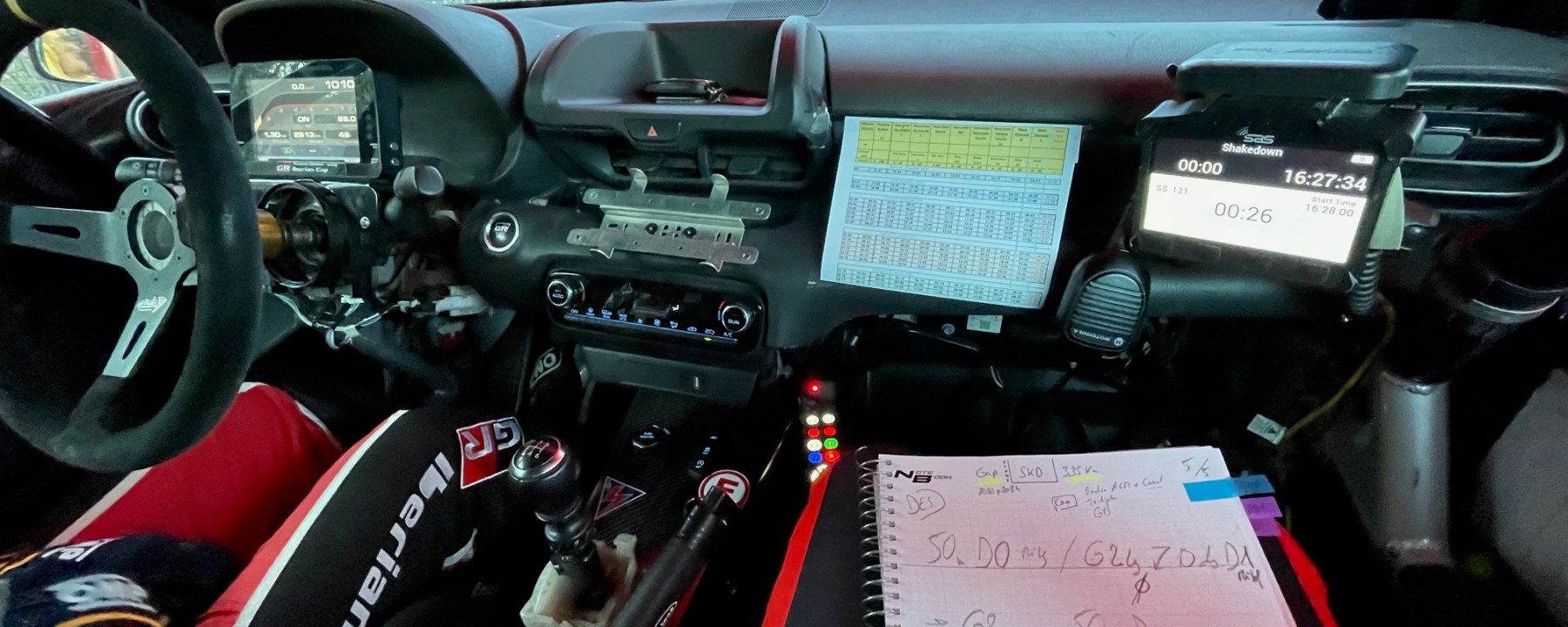 Viens l’heure de faire ou refaire plutôt, connaissance avec l’équipe de Téo Martin Motorsport qui comme l’an dernier, fournit et entretient les voitures 0 et 0 spare. Réglages des baquets, des harnais, vérifications et explications sur les quelques points techniques, l’intercom avec nos casques et Mickeys et pour moi, installation de mon bureau. En plus du GPS SAS comme les concurrents, du téléphone portable, du téléphone satellite et de la radio (oui ça ne me laisse plus beaucoup de place), j’installe différents pense bête pour avoir toutes les informations sur les yeux: horaires d’entrée dans les spéciales, canaux radio par spéciale et tableau du plan de refuel. Cette année nous pourrons effectuer le ravitaillement en zone de RZ, alors que les années précédentes nous devions le faire en station service, plus long et un peu plus stressant car dépendant de la disponibilité du SP98 et surtout du monde devant nous. Je devais en amont répertorier toutes les stations sur le routier pour pouvoir recalculer les kilométrages. Je pourrais presque vous donnez les différences de prix sur la liaison Monaco – Digne les Bains !