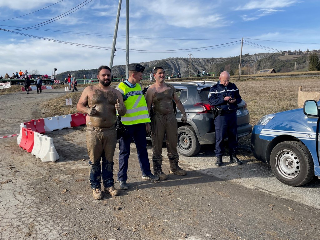 Plus de 0, l’improbable c’est produit. La course est quand même partie mais l’équipe sécurité perd d’un coup les deux voitures #0 et cherche des solutions. Pendant ce temps, bloqués à 800m d’un croisement pour sortir de la spéciale, nous devons attendre le passage du dernier concurrent pour être évacués. Forcément frustrés avec un sentiment d’inutilité, les quelques spectateurs présents nous prennent en pitié et nous offrent à boire et un sandwich pour patienter au soleil. Cela aurait pu être pire c’est certains. Encore un grand merci à vous. Nous trouvons même le moyen de croiser le pilote japonais Suguru Kawana, déjà vu en France en 208 Rally4, et Gilbert Magaud venu en voisin. Après 1h30, nous avons l’autorisation de rejoindre le croisement pour évacuer. Il nous aura fallu un peu de bras pour sortir de ce champ boueux mais une fois lancé dans la pente, nous avons pu rejoindre le point d’extraction sans difficulté. Nous attendons l’équipe sous le regard curieux des spectateurs qui quittent la spéciale. Questions, photos et même une petite démo de ventriglisse !